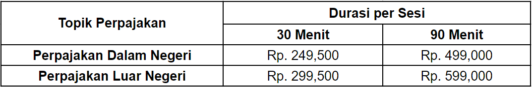 - Konsultasi dilakukan dalam 1 sesi dengan pilihan durasi waktu 30 menit atau 90 menit menggunakan zoom, google meet, skype, atau google duo bersama Tax Expert kami.